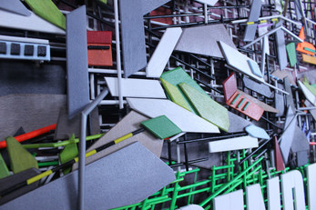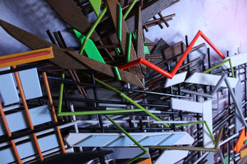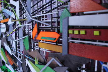 1000's of individually hand cut, shaped, sanded, and painted pieces of wood form this Ascendant themed marble run.