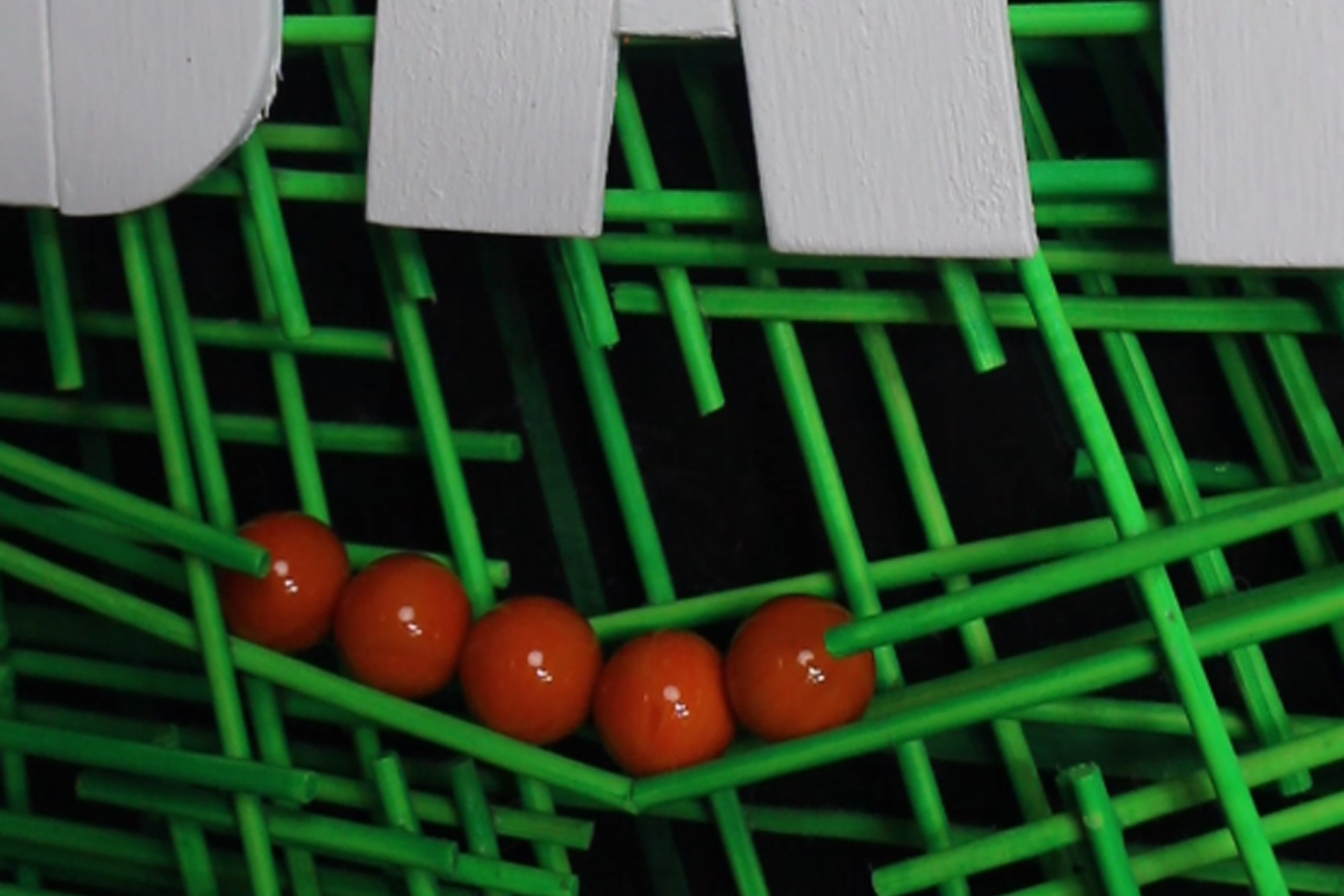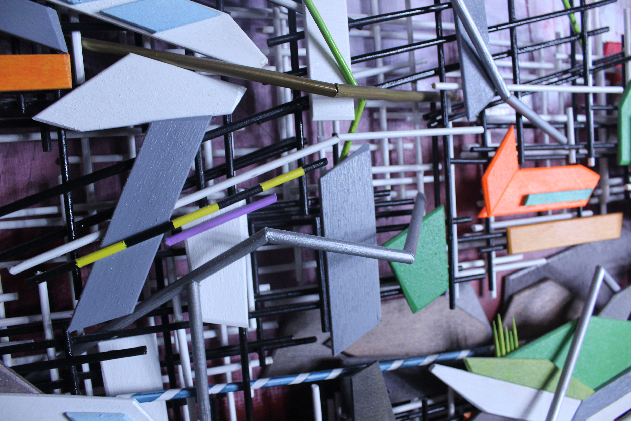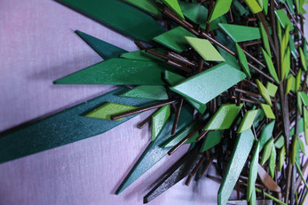 Bamboo, wood scraps, iridescent/fluorescent/phosphorescent paint, glitter, powder pigment, marbles.